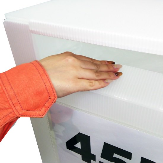 投入口がついた折りたたみプラダンボックスです。オフィスやお店ででた不用品の回収などに便利です。